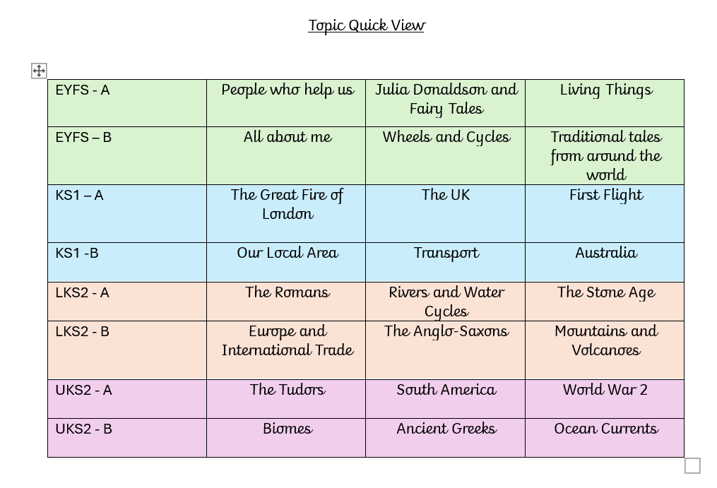 We have spent time re-shaping our curriculum over time, ensuring our pupils receive coherent and sequenced teaching over time. Our topic overview provides a quick way to see the drivers of our learning over the terms.